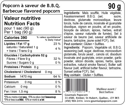 Maïs soufflé, Huile végétale, Assaisonnement B.B.Q. (sel, sucre, dextrose, glutamate monosodique, levure torula, huile de canola, inosinate et guanylate disodique, oignon en poudre, ail en poudre, bioxyde de silicium, épices, herbes, extrait d’épice, saveur naturelle de fumée), Sel à saveur de beurre (sel, saveur artificielle de beurre, tartrazine, jaune soleil FCF), Sel.