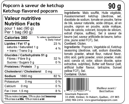 Maïs soufflé, Huile végétale, Assaisonnement ketchup (dextrose, sel, diacétate de sodium, tomate en poudre, farine de blé, saveur naturelle, acide citrique, ail en poudre, oignon en poudre, acide malique, huile de canola, colorant, bioxyde de silicium, extrait d’épice, sulfites), Sel à saveur de beurre (sel, saveur artificielle de beurre, tartrazine, jaune soleil FCF), Sel.