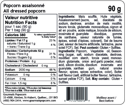 Maïs soufflé, Huile végétale, Assaisonnement (sucre, sel, diacétate de sodium, dextrose, amidon de maïs modifié, levure torula, glutamate monosodique, oignon et ail en poudre, acide malique, bioxyde de silicium, inosimate et guanylate disodique, gomme de xanthane, saveur naturelle de fumée, épices, extrait d’épices, colorant), Sel de beurre (sel, saveur de beurre artificielle, tartrazine, jaune soleil FCF), Sel. Peut contenir: Gluten • Sulfites.